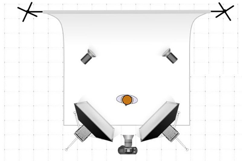 Для построения полноценной схемы мягкого света потребуется четыре источника постоянного или импульсного света (минимально — два, но качество будет ниже). Направьте пару на фон, ещё два — на главный объект под углом около 45 градусов, и вы получите выраженный фронтальный свет вместе с равномерно засвеченным задником.