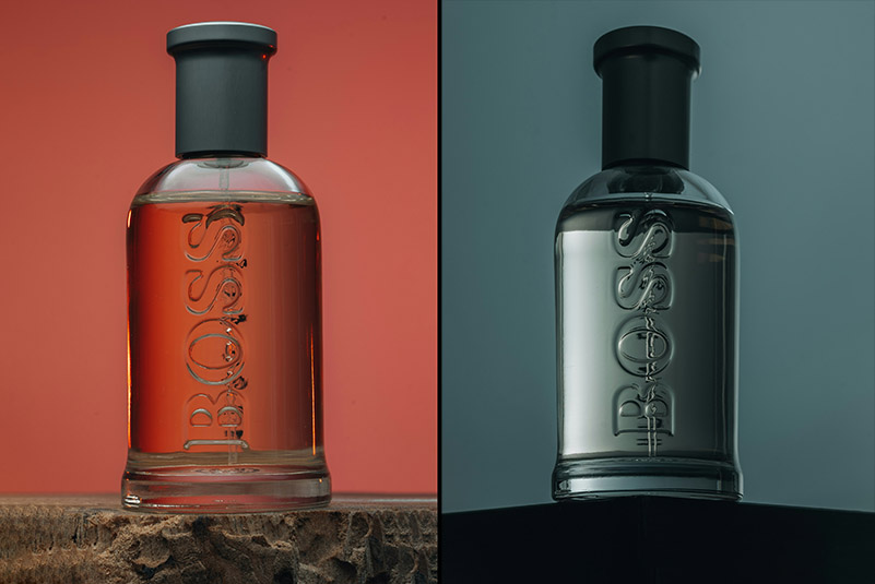 Сравним два снимка одного и того же продукта. Слева флакон равномерно освещён сверху и с боков, вероятно, в лайткубе. Справа — использован более жёсткий боковой свет, направленный вдоль флакона слева и немного на просвет.