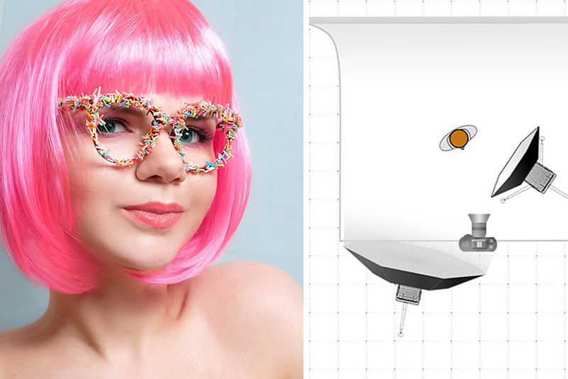 Алгоритм постановки следующий. Мысленно проведите линию между камерой и лицом модели, а затем сместите источник света по дуге окружности на 45 градусов вправо или влево — направление принципиального значения не имеет. После этого поднимите источник так, чтобы свет падал сверху под углом около 45 градусов.