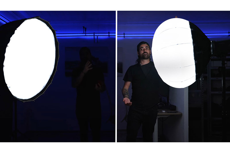 Вернёмся к сравнению с классическим софтбоксом. Например, для съёмки видео, где человек подходит к столу, сферический софтбокс будет удачным решением. Но если стоит задача снять портрет на чёрном фоне, ситуация меняется.