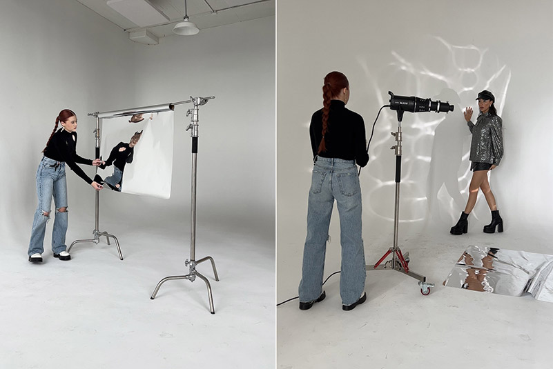 Отражённый от зеркального пластика свет может быть как единственным источником в сцене, так и частью сложной световой схемы. Обратите внимание на коллаж ниже: на снимке слева отзеркаленный свет работает только по фону, в то время как лицо модели освещается отдельно; а на фото справа отражённый от пластика свет освещает сразу всю сцену — легко догадаться по теням на фоне.
