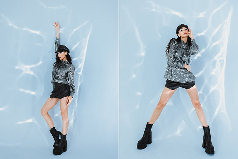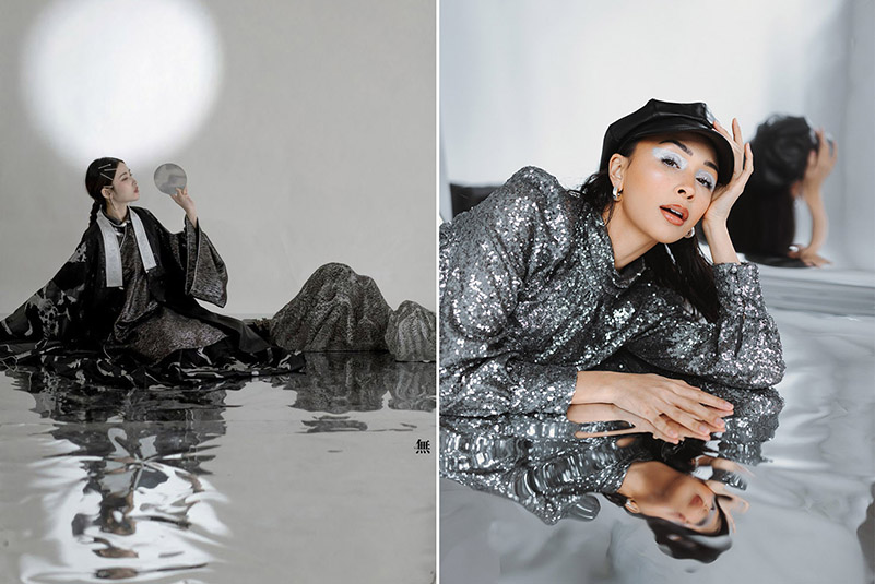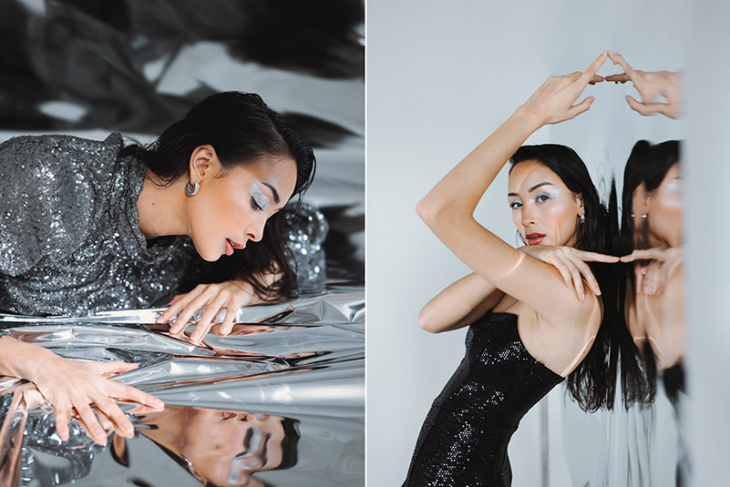 Ещё оба варианта использования зеркального пластика можно комбинировать. Например, на двух кадрах ниже зеркало одновременно выполняет роль фона, заполняя пространство, и создаёт блики на лице модели, делая свет интереснее.